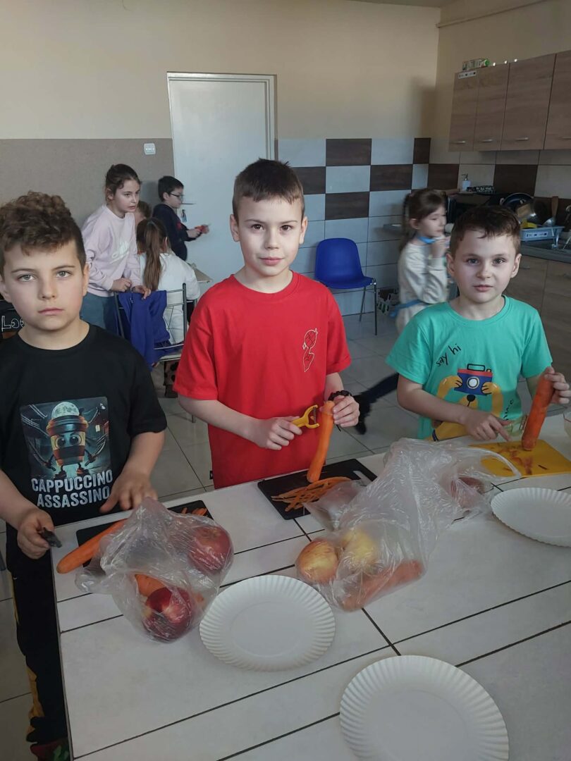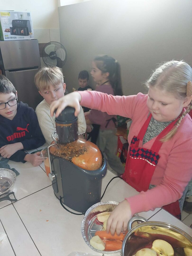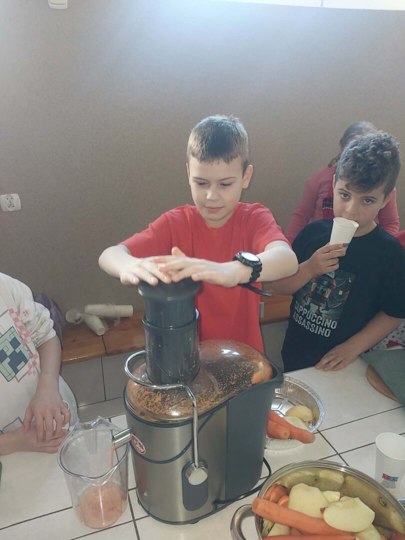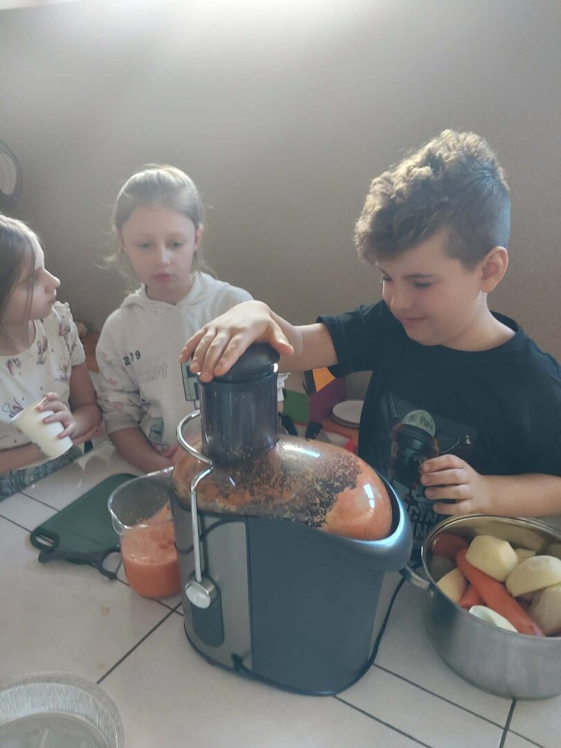 To jednak nie wszystko! 💪 Uczniowie samodzielnie wykonali także świeży sok z jabłek i marchewki – zdrowy, naturalny i pełen witamin. 🥕🍎🍹 Podczas pracy uczyli się zasad bezpieczeństwa, higieny oraz właściwego korzystania ze sprzętów kuchennych.