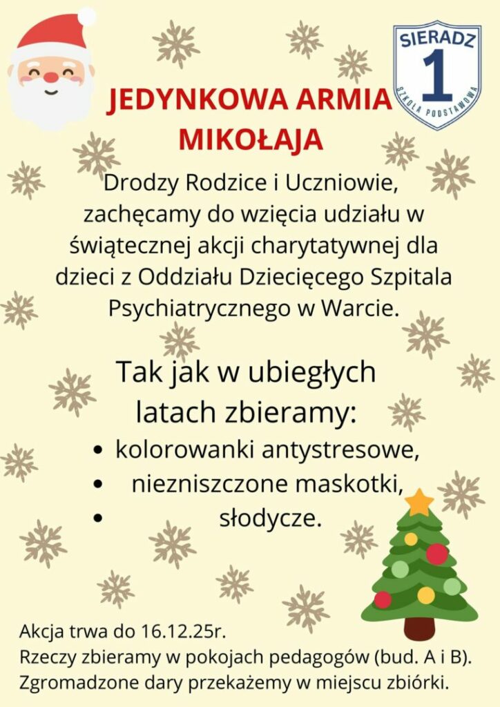 Jak co roku z radością zachęcamy do wzięcia udziału w Jedynkowej Armii Mikołaja 🎅🎁. To wyjątkowa akcja charytatywna, której celem jest wywołanie uśmiechu na twarzach dzieci z Oddziału Dziecięcego Szpitala Psychiatrycznego w Warcie 💖🏥.