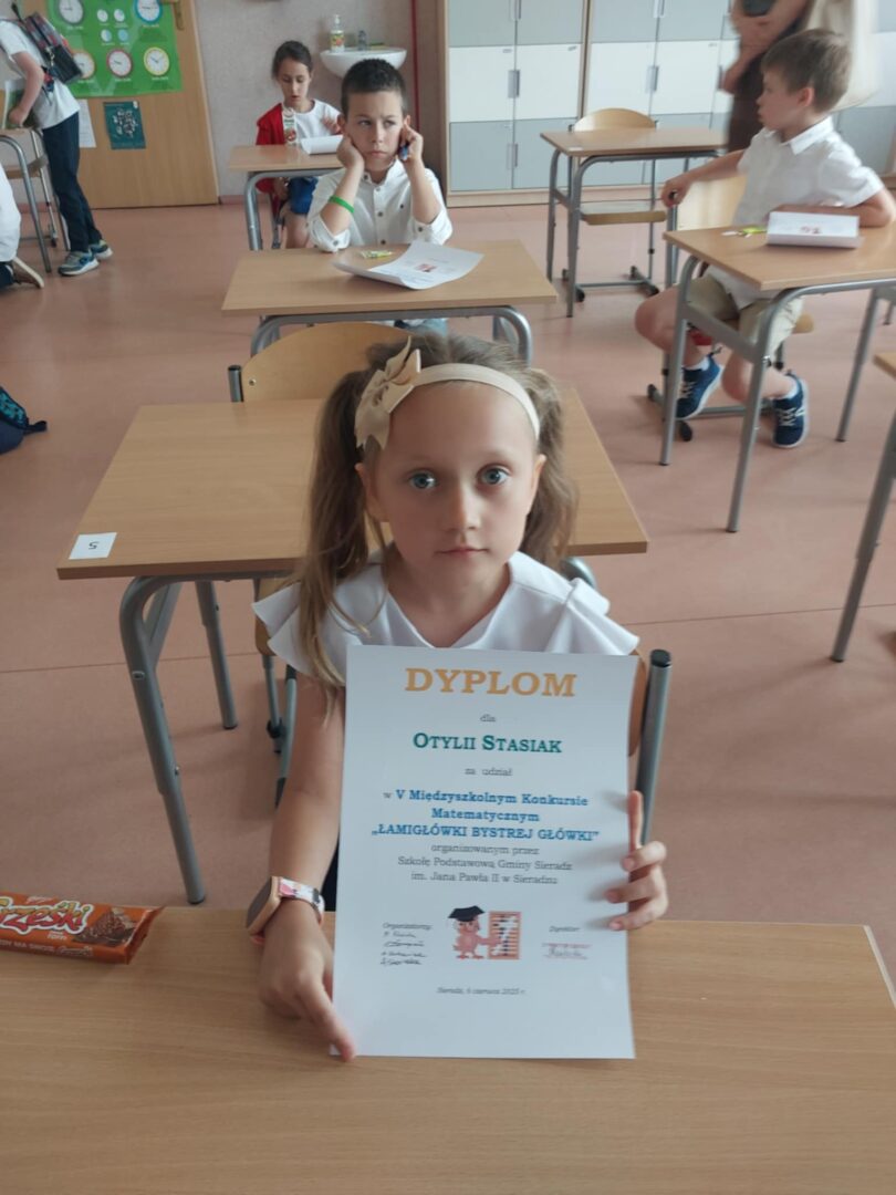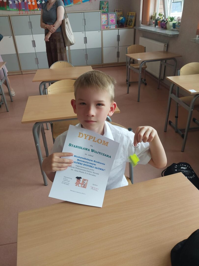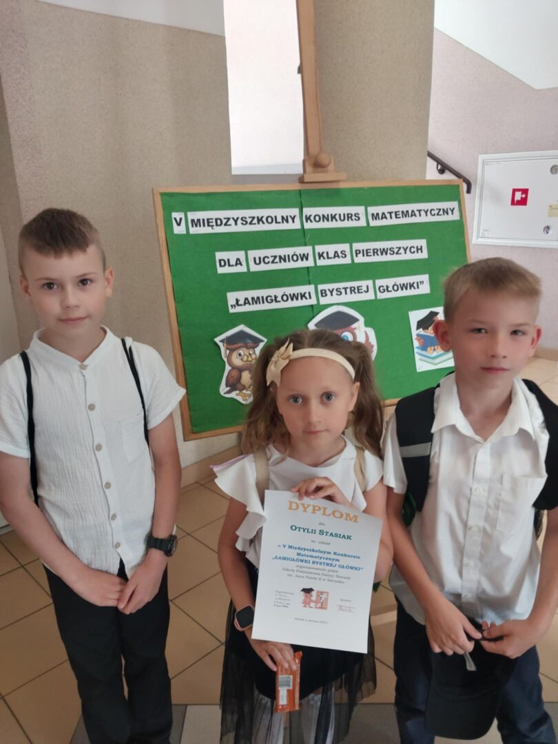 Z radością informujemy, że dziś, 6 czerwca, troje uczniów naszej szkoły z klas pierwszych — Otylia Stasiak kl 1a , Stanisław Wojtczak kl 1a oraz Kacper Łuszkiewicz kl 1b — reprezentowało naszą szkołę w V Międzyszkolnym Konkursie Matematycznym dla uczniów klas pierwszych „Łamigłówki Bystrej Główki”organizowanym przez Szkołę Podstawową Gminy Sieradz. Z ogromną dumą ogłaszamy, że Kacper Łuszkiewicz kl 1b zdobył trzecie miejsce🥉🎉w tym wymagającym konkursie!
