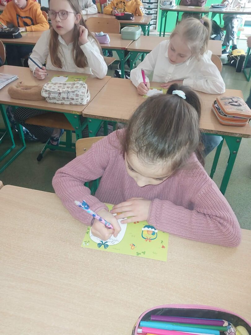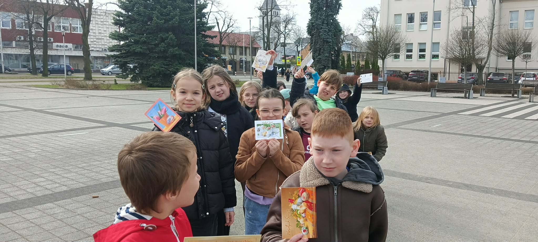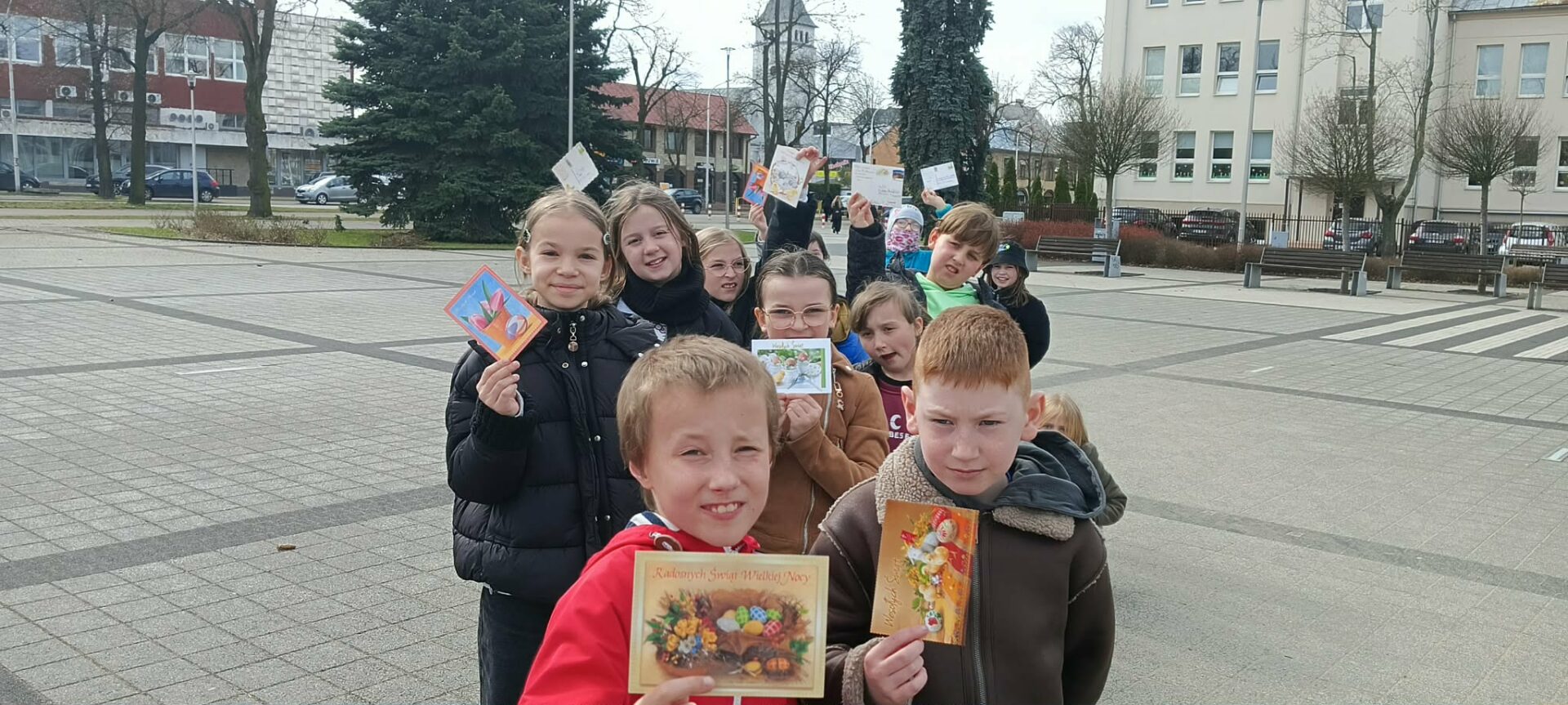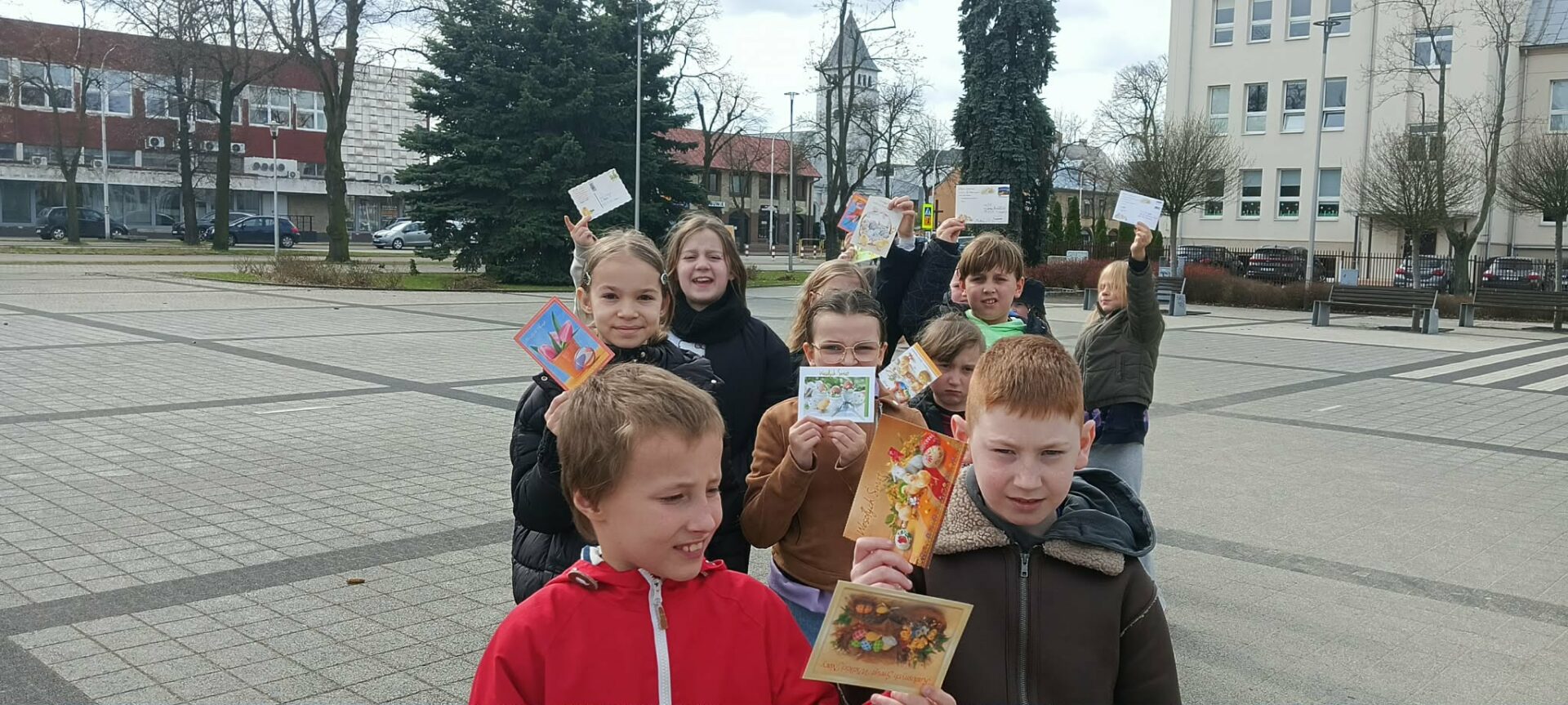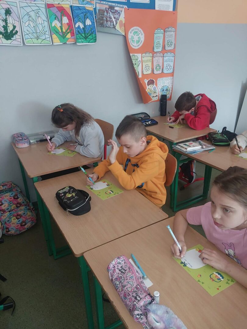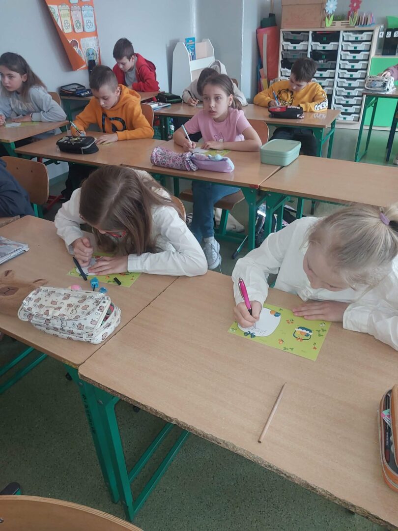 Dzieci własnoręcznie napisały kartki z życzeniami z okazji Świąt Wielkiej Nocy 🐥🌷, starannie je zaadresowały ✍️, a następnie wybrały się na pocztę 🏤, gdzie przykleiły znaczki 🪪📮 i wrzuciły kartki do skrzynki pocztowej 📨