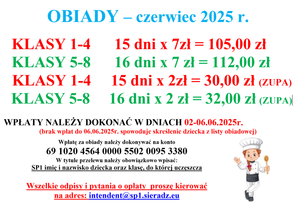 Nr konta 69 1020 4564 0000 5502 0095 3380 w tytule wpisać SP1 obiady, imię, nazwisko dziecka oraz klasę.