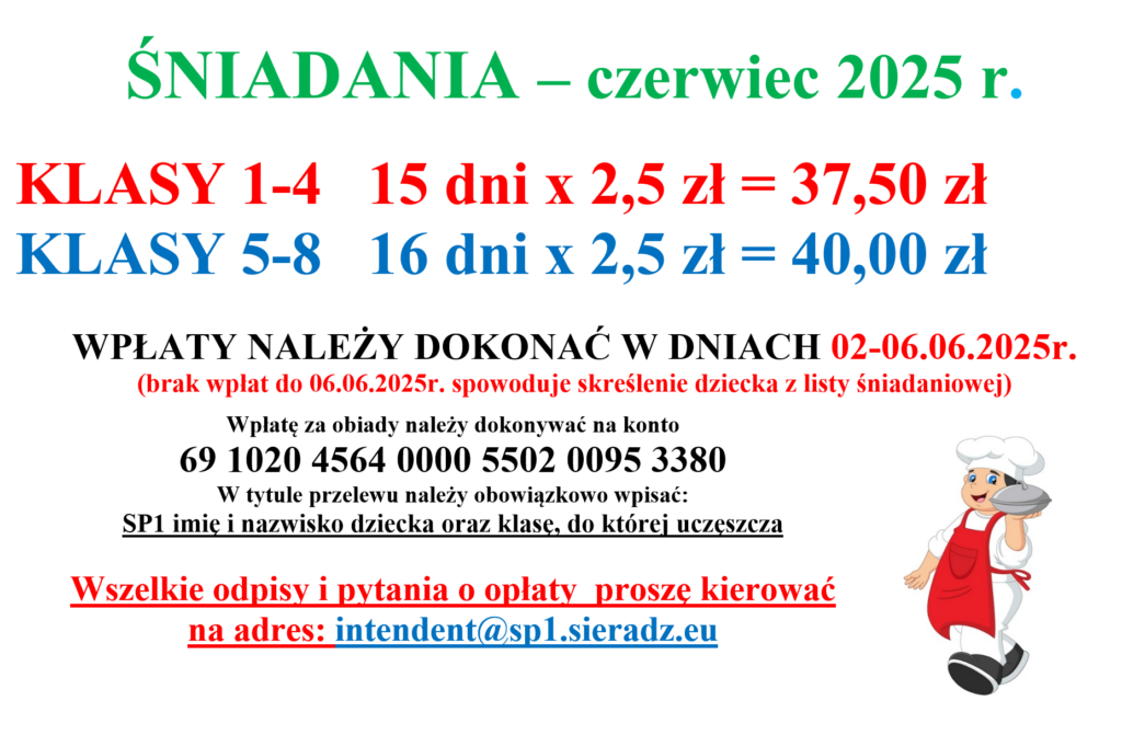 Nr konta 69 1020 4564 0000 5502 0095 3380 w tytule wpisać SP1 śniadania, imię, nazwisko dziecka oraz klasę.