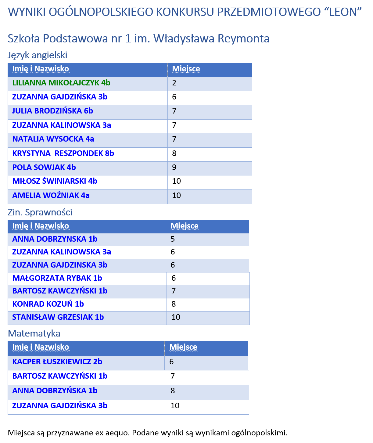 Z ogromną radością informujemy o znakomitych wynikach naszych uczniów w Ogólnopolski Konkurs Przedmiotowy LEON – sesja jesienna 📚✨.