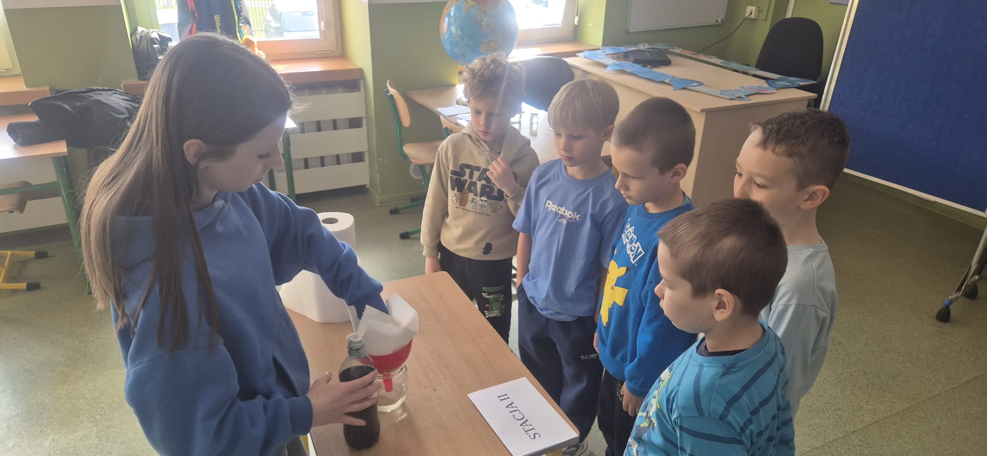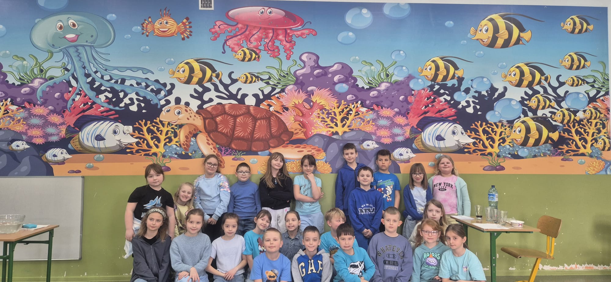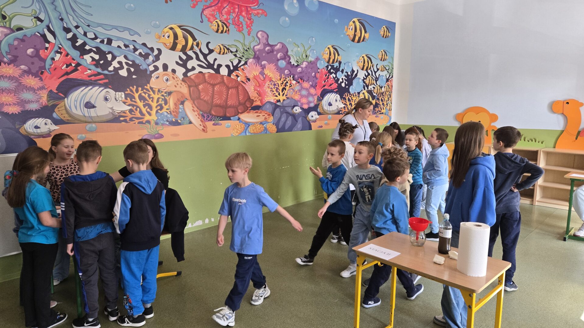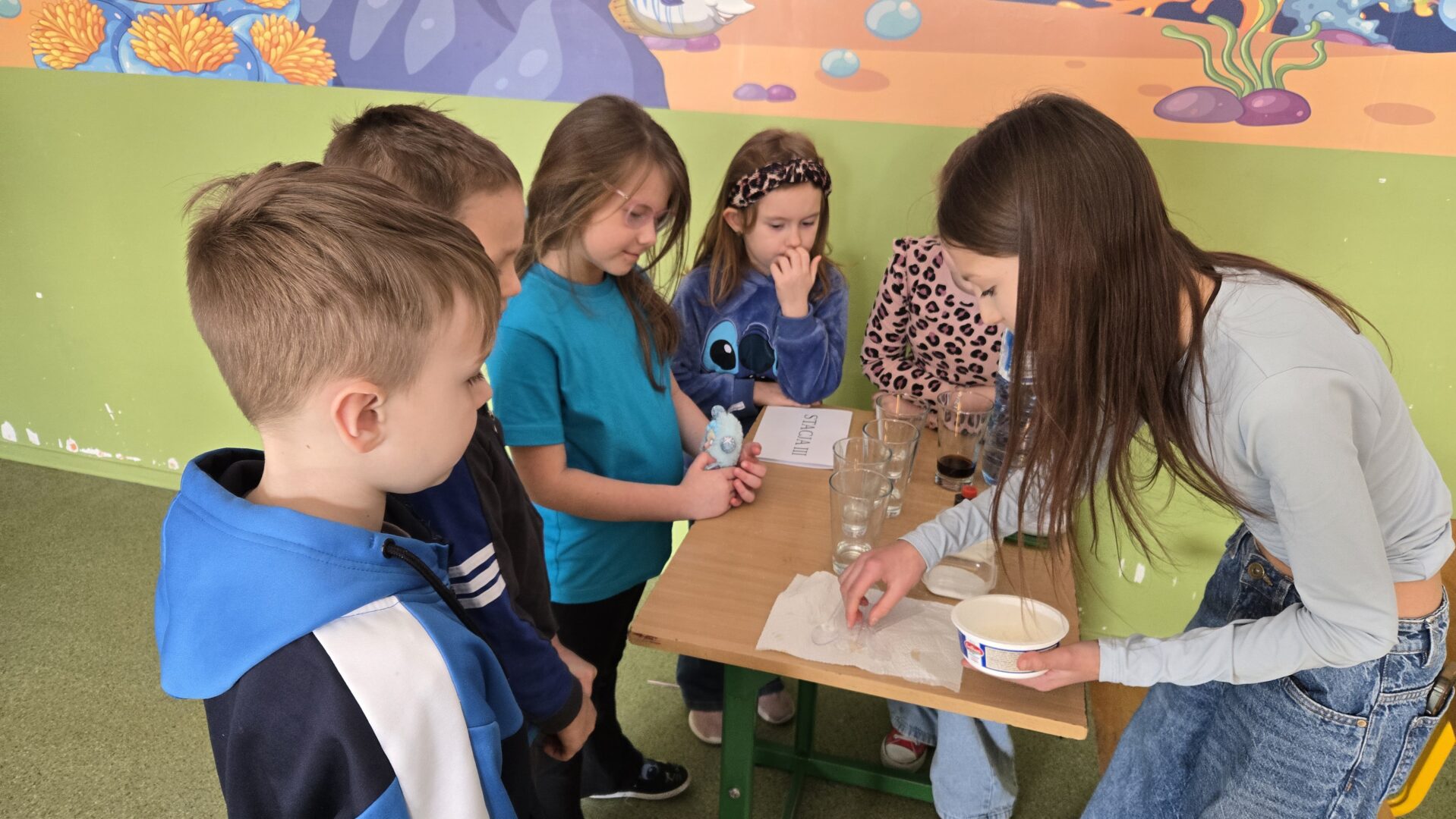 Nie zabrakło również pogadanki, podczas której rozmawialiśmy o tym, jak ważne jest oszczędzanie wody i dbanie o jej zasoby. Uczniowie dowiedzieli się, ile wody znajduje się na naszej planecie oraz jak niewielka jej część nadaje się do picia. To była cenna lekcja uświadamiająca, że każdy z nas ma wpływ na ochronę tego bezcennego skarbu.