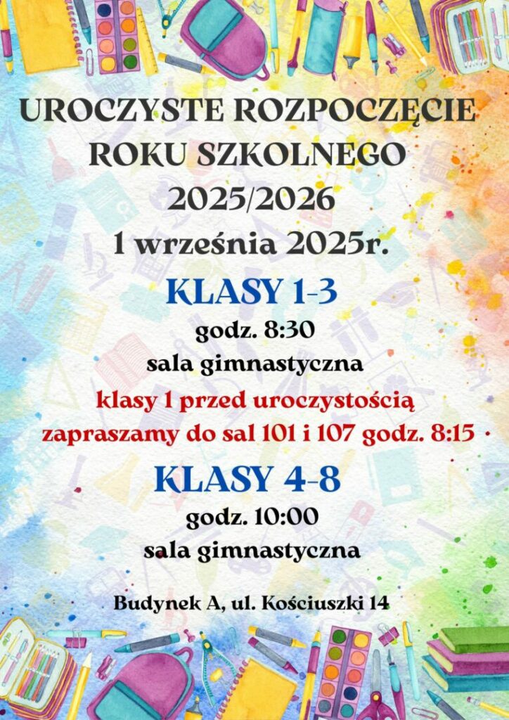 Dyrekcja Szkoły Podstawowej nr 1 wita wszystkich uczniów po wakacyjnej przerwie i zaprasza na uroczyste rozpoczęcie roku szkolnego 2025/2026, które odbędzie się 1 września 2025 r. w sali gimnastycznej przy ul. Kościuszki 14.