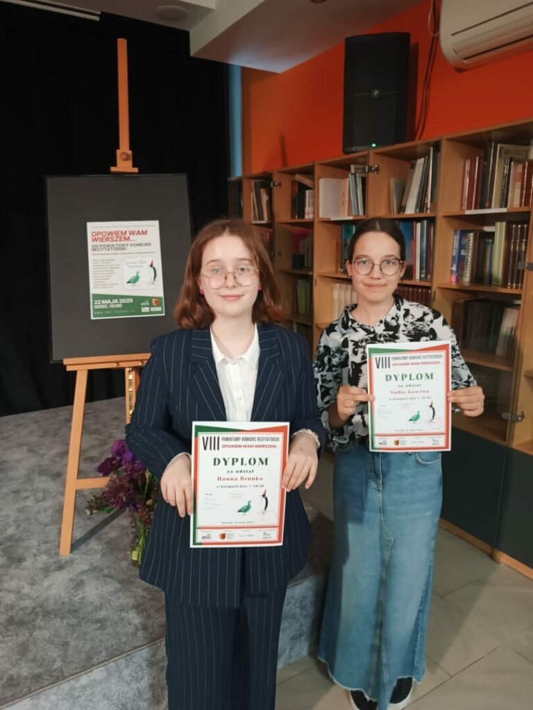 Z trudną, ale jakże piękną sztuką recytacji zmierzyły się dwie nasze uczennice: Nadia Gawron z kl.VI b oraz Hanna Bronka z kl. VII b. Brawo dla Nadii i Hani za odwagę i wrażliwość na piękno języka poetyckiego!