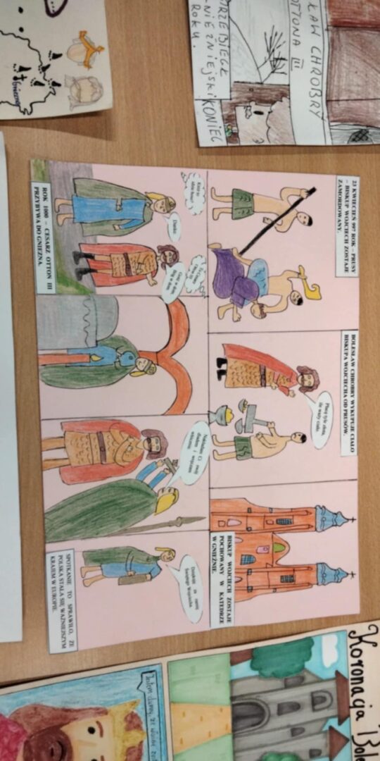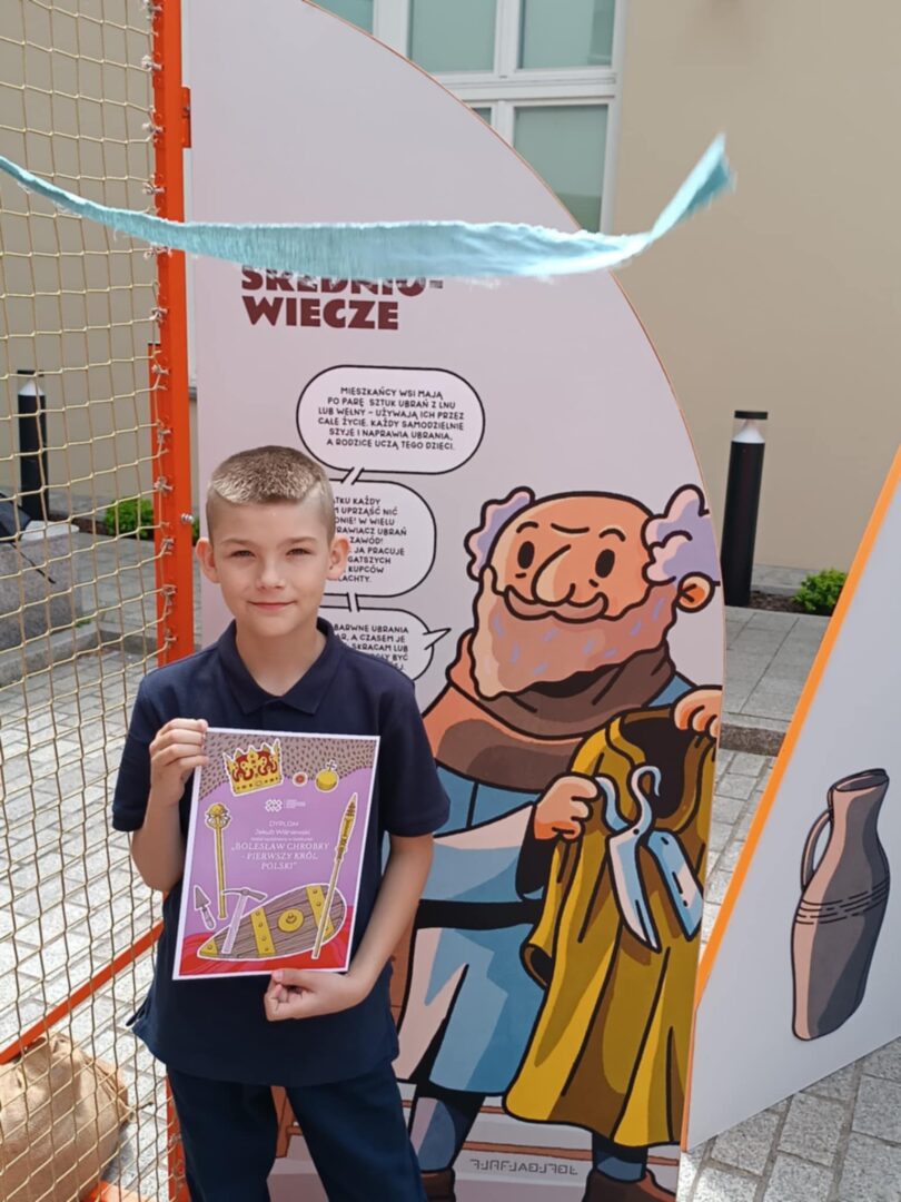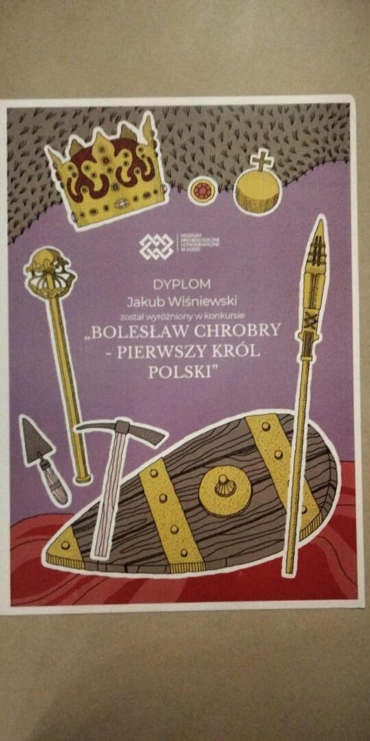 2 czerwca 2025 r. w Muzeum Archeologicznym i Etnograficznym w Łodzi odbył się finał i wręczenie nagród w Wojewódzkim Konkursie „Bolesław Chrobry – pierwszy król Polski”. Treści konkursu nawiązywały do ogólnopolskich obchodów 1000-lecia Koronacji Bolesława Chrobrego, do których nasza szkoła włączyła się w marcu i kwietniu (realizacja projektu historycznego). Zadanie konkursowe polegało na stworzeniu komiksu na jeden z tematów związanych z pierwszym królem Polski. Spośród 96 prac wyłoniono 5 miejsc oraz 16 wyróżnień. Miło nam poinformować, iż uczeń klasy 4a – Jakub Wiśniewski – zdobył wyróżnienie. Kuba wziął udział w warsztatach archeologicznych oraz minilekcji o archeologii. Obejrzał też jeden z najcenniejszych numizmatów w zbiorach muzeum – oryginalny srebrny denar Bolesława Chrobrego.
