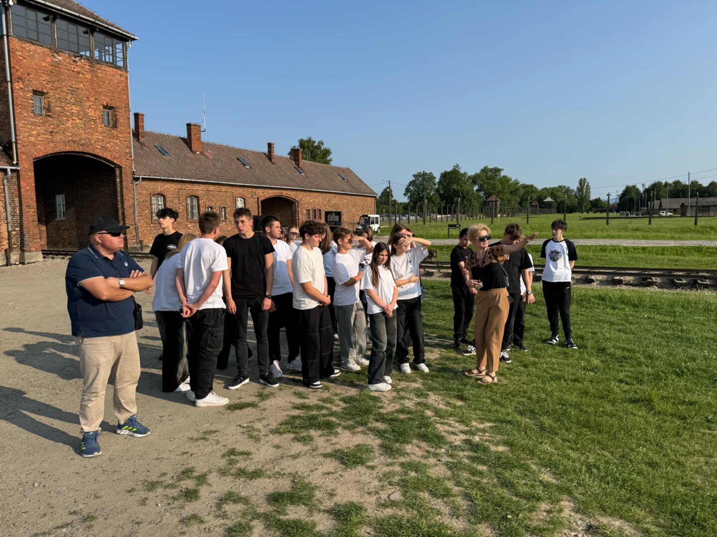 Pod opieką przewodników uczniowie zwiedzili teren byłego niemieckiego nazistowskiego obozu koncentracyjnego i zagłady. Mieli okazję zobaczyć baraki więźniarskie, rampę kolejową, ruiny krematoriów, a także liczne ekspozycje muzealne dokumentujące codzienne życie więźniów i skalę zbrodni dokonanych w tym miejscu.